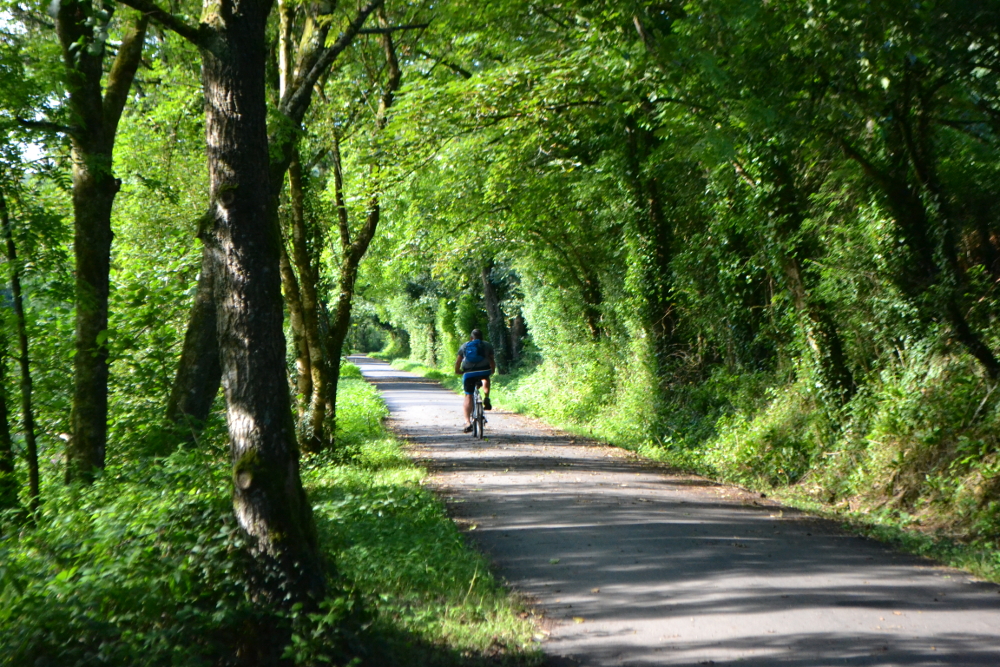The trail is a disused railway line which has small sections of very slight incline (1-2 degrees) but otherwise is flat and well surfaced (tarmac or thin gravel)